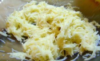 Картофель, берем крупный, очищаем и натираем на средней терке, добавляем 1 ст. л. муки, солим, перчим, перемешиваем.