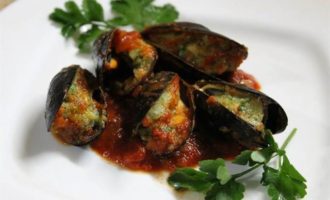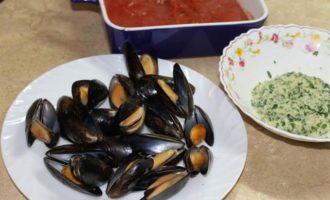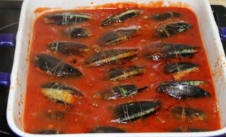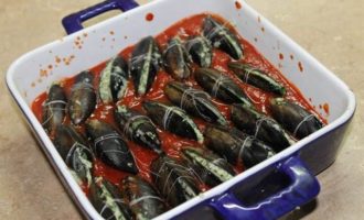 В форму для запекания налейте томатный соус. Мидии нафаршируйте подготовленной начинкой, закройте ракушку и закрепите ниткой, сделав несколько оборотов вокруг раковины.
