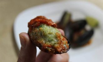 Соедините размоченные хлебные крошки с петрушкой, чесноком и сыром, тщательно перемешайте, добавив соль, перец и немного выделившегося сока от мидий. Начинка готова.