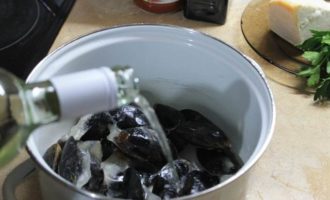 Мидии не размораживая, положите в кастрюлю, добавьте немного белого вина и на большом огне доведите до кипения. Как только мидии раскроются, можно снять с огня. На это вам потребуется 3 — 4 минуты времени.