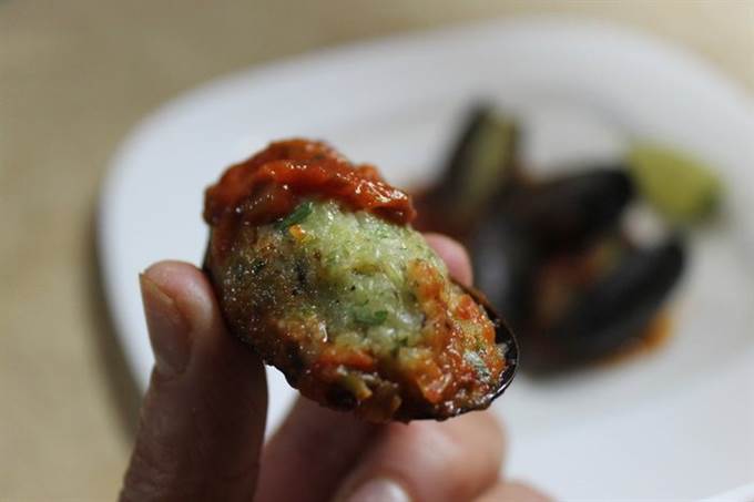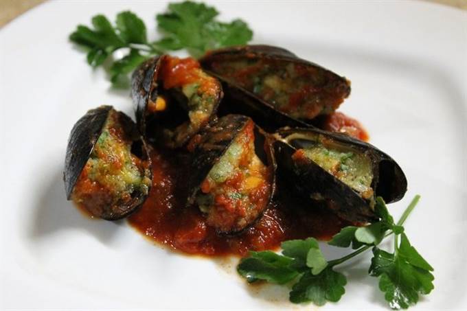 Соедините размоченные хлебные крошки с петрушкой, чесноком и сыром, тщательно перемешайте, добавив соль, перец и немного выделившегося сока от мидий. Начинка готова.