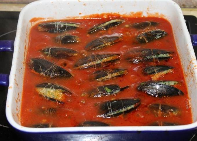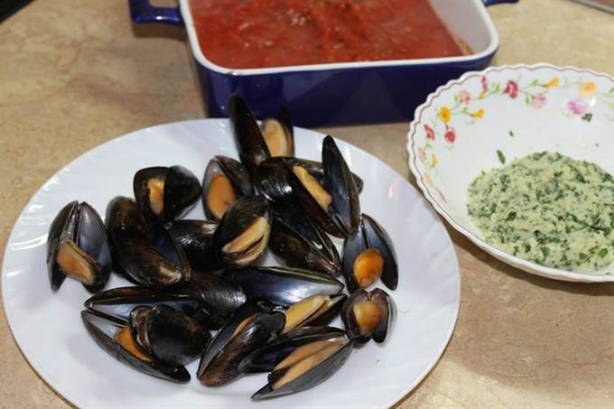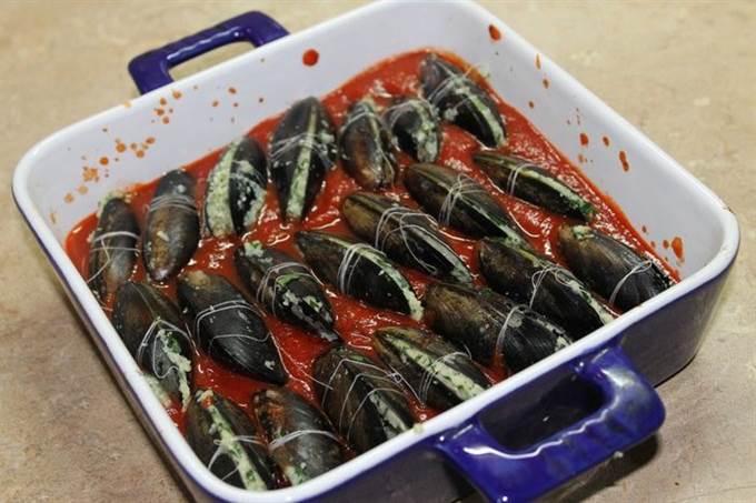В форму для запекания налейте томатный соус. Мидии нафаршируйте подготовленной начинкой, закройте ракушку и закрепите ниткой, сделав несколько оборотов вокруг раковины.