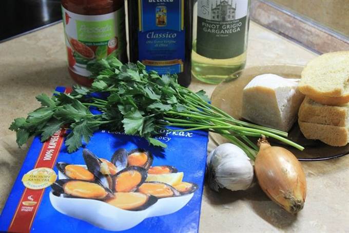 Пока мидии раскрываются, нарежьте мелко петрушку, натрите чеснок и сыр Пекорино или любой твердый, какой у вас есть.