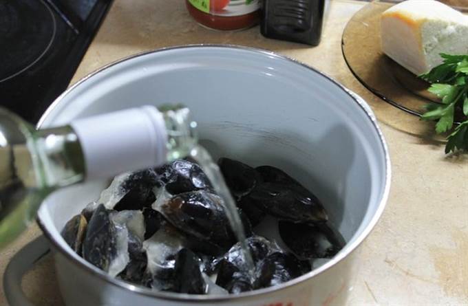 Мидии не размораживая, положите в кастрюлю, добавьте немного белого вина и на большом огне доведите до кипения. Как только мидии раскроются, можно снять с огня. На это вам потребуется 3 — 4 минуты времени.