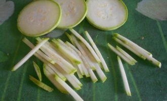 • Кабачок нарезать кружками, затем нашинковать полосками шириной 3 миллиметра.