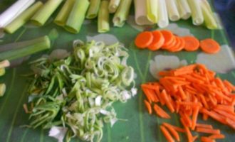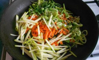 • Овощи, морковь, лук порей, кабачок жарить с растительном маслом на сковороде с антипригарным покрытием.