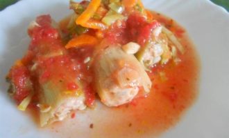 • Фаршированный порей положить в форму для выпекания, добавить пассированные овощи.