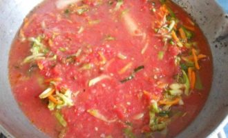 • В томатный сок солить, положить мелко нарезанную петрушку. Налить к луку-порею с овощами.