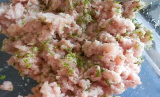 • Из филе рыбы приготовить фарш с помощью комбайна. Рыбный фарш солить, перчить. Нашинковать мелко петрушку (с веточками), перемешать.