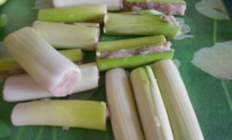 • У лука-порея отрезать круглую и толстую часть. Два раза по 6 сантиметров.