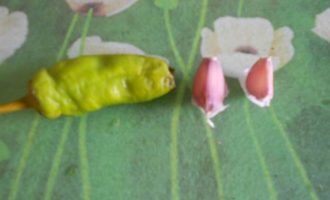 • Горький перец и целых два зубца чеснока мелко нарезать (чеснок необходимо нарезать!). Добавить на сковороду к овощам.