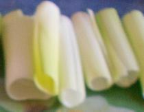 • Из круглых частей лука-порея, отрезанных по 6 сантиметров, сделать трубочки для фаршировки. Необходимо трубочки варить две минуты в кипящей воде и процедить через сито.