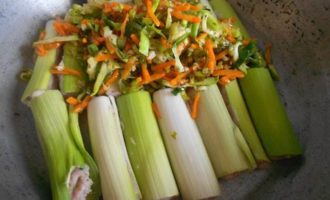 • Готовое блюдо. Фаршированная зеленая, круглая часть лука-порея получилась вкусной, мне понравилась.
