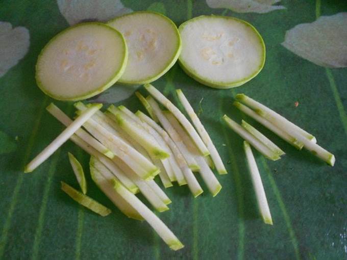 • Кабачок нарезать кружками, затем нашинковать полосками шириной 3 миллиметра.