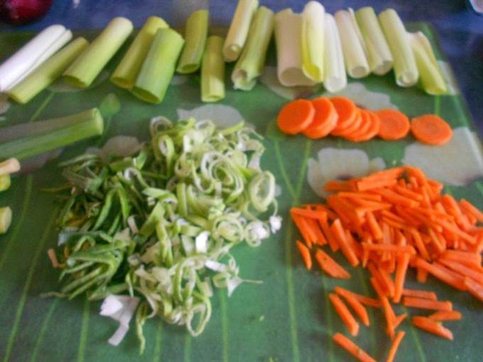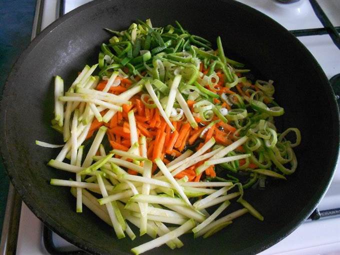• Овощи, морковь, лук порей, кабачок жарить с растительном маслом на сковороде с антипригарным покрытием.
