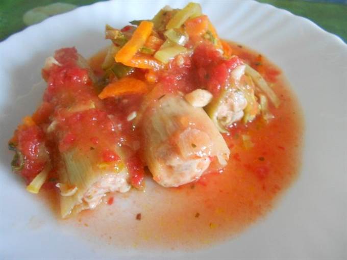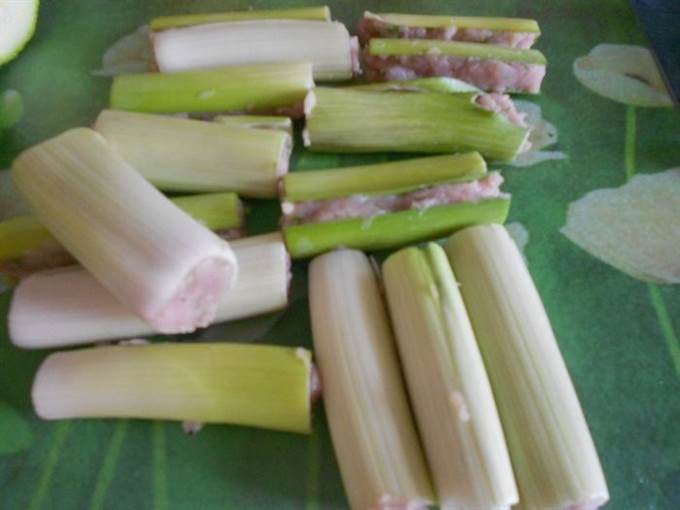 • Готовое блюдо. Фаршированная зеленая, круглая часть лука-порея получилась вкусной, мне понравилась.