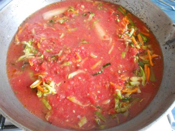 • В томатный сок солить, положить мелко нарезанную петрушку. Налить к луку-порею с овощами.