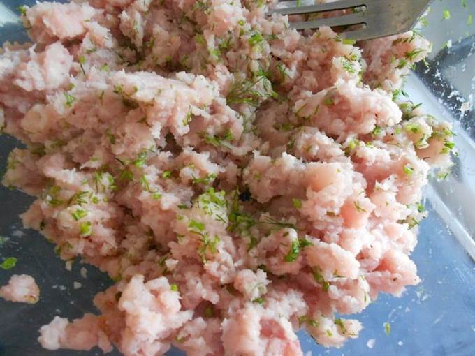 • Из филе рыбы приготовить фарш с помощью комбайна. Рыбный фарш солить, перчить. Нашинковать мелко петрушку (с веточками), перемешать.