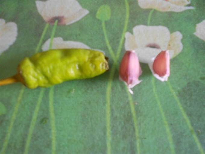 • Горький перец и целых два зубца чеснока мелко нарезать (чеснок необходимо нарезать!). Добавить на сковороду к овощам.