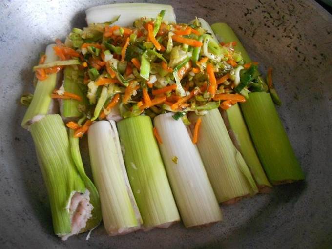 • Фаршированный порей положить в форму для выпекания, добавить пассированные овощи.
