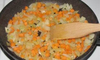 Разогреть на сковороде 2 ст. л. оливкового масла и обжарить лук до прозрачности. Затем добавить нарезанную мелким кубиком морковь. Жарить еще 5-7 минут.