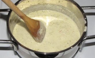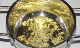 Тем временем приготовить соус. Разогреть в сотейнике оставшуюся 1 ст. л. оливкового масла. Нарубить мелко чеснок и слегка прогреть его.