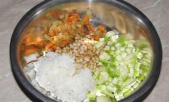 Кабачок нарезать кубиком. Соединить в миске подготовленные ингредиенты — рис, лук с морковью, орешки и кабачок. Посолить и перемешать. Начинка готова.