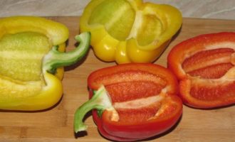 Перцы разрезать вдоль на две части, вместе с плодоножкой. Удалить семена и белые перепонки.
