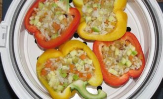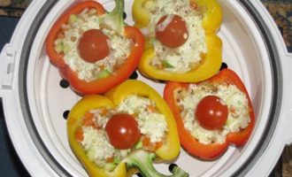 Начинить половинки перце овощами. Выложить в контейнер пароварки. Готовить 15 минут.