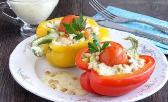 Готовые перцы разложить в тарелки, полить соусом, посыпать орешками. И подавать к ужину, как самостоятельно блюдо. Приятного аппетита!