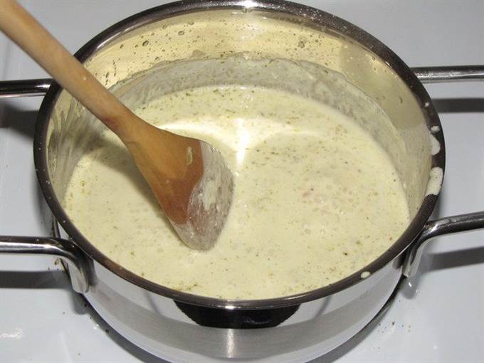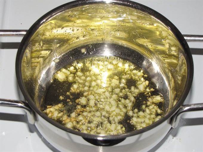 Тем временем приготовить соус. Разогреть в сотейнике оставшуюся 1 ст. л. оливкового масла. Нарубить мелко чеснок и слегка прогреть его.