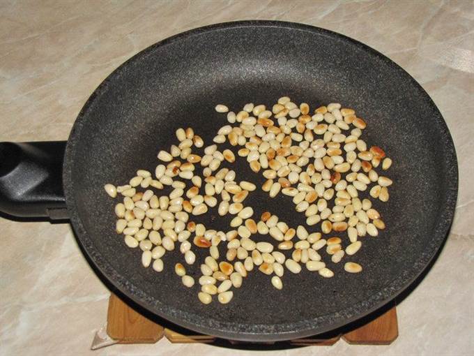 Орешки поджарить на сухой сковороде до золотистого цвета.
