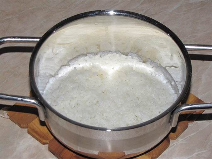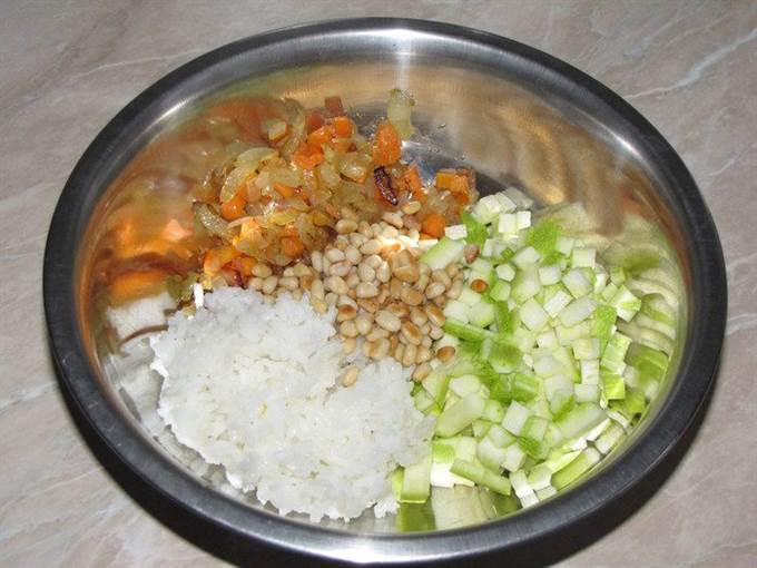 Кабачок нарезать кубиком. Соединить в миске подготовленные ингредиенты — рис, лук с морковью, орешки и кабачок. Посолить и перемешать. Начинка готова.