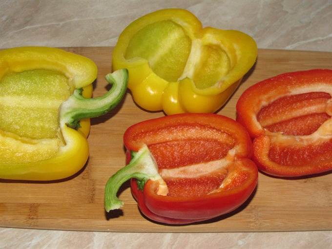 Перцы разрезать вдоль на две части, вместе с плодоножкой. Удалить семена и белые перепонки.