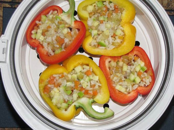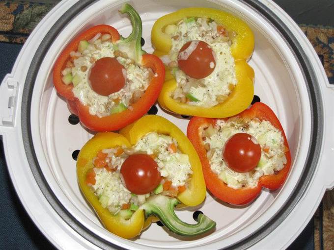 Начинить половинки перце овощами. Выложить в контейнер пароварки. Готовить 15 минут.