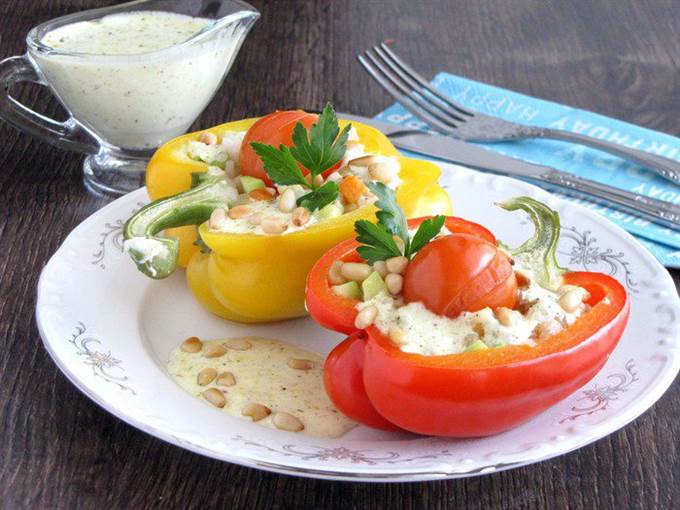 Готовые перцы разложить в тарелки, полить соусом, посыпать орешками. И подавать к ужину, как самостоятельно блюдо. Приятного аппетита!