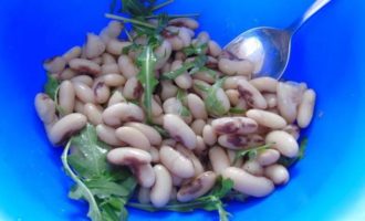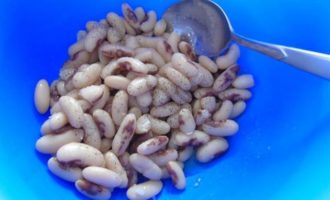 • Фасоль замочите на несколько часов, а лучше на ночь и отварите до готовности. Отцедите от жидкости. Сбрызните 1 ст.л. оливкового масла, поперчите, посолите и влейте яблочный уксус. Перемешайте.