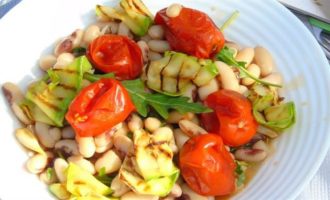 • Выложить фасоль на тарелку, сверху разложите цукини и помидоры с чесноком. Полейте соком оставшимся после запекания помидоров.