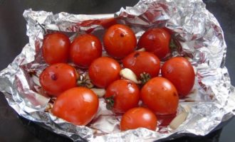 • Помидоры выложите в посуду, или же как я сделала из фольги, немного посолите и поперчите. Чеснок очистить и отправить к помидорам. Полить 1 ст.л. оливкового масла и бальзамическим уксусом. Перемешать и отправить в разогретую до 170°C духовку на 15-20 минут.