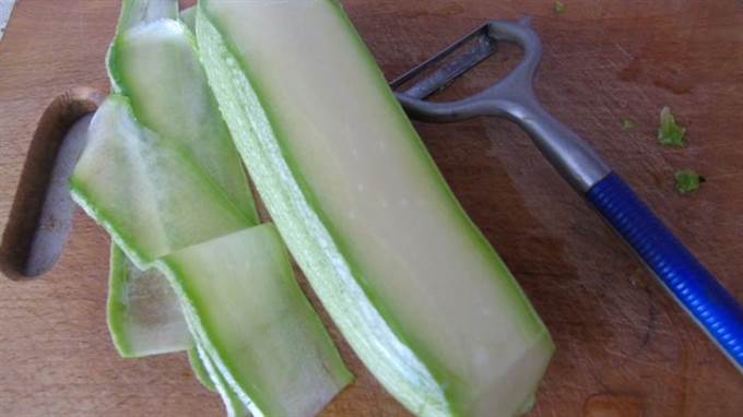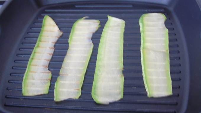 • Разогреть сковороду гриль и обжарить кабачок с двух сторон.