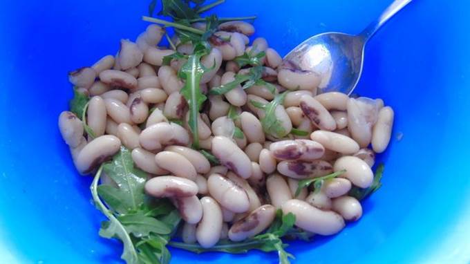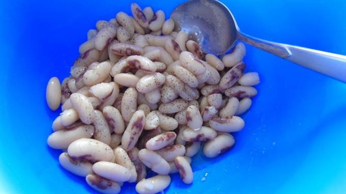 • Фасоль замочите на несколько часов, а лучше на ночь и отварите до готовности. Отцедите от жидкости. Сбрызните 1 ст.л. оливкового масла, поперчите, посолите и влейте яблочный уксус. Перемешайте.