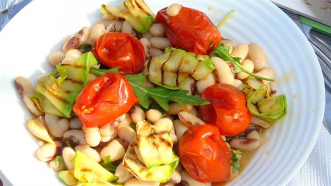 • Выложить фасоль на тарелку, сверху разложите цукини и помидоры с чесноком. Полейте соком оставшимся после запекания помидоров.