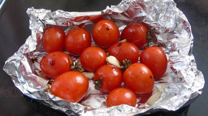 • Помидоры выложите в посуду, или же как я сделала из фольги, немного посолите и поперчите. Чеснок очистить и отправить к помидорам. Полить 1 ст.л. оливкового масла и бальзамическим уксусом. Перемешать и отправить в разогретую до 170°C духовку на 15-20 минут.
