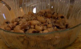 Готовую фасоль сбрызнуть оставшимся оливковым маслом, поперчить смесью нескольких видов перца, влить уксус из яблочного сидра, посолить.