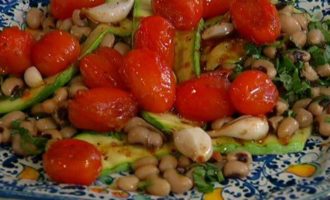 Выложить фасоль на тарелку, сверху разложить цукини и помидоры с чесноком. Полить соком, оставшимся в противне от помидоров.