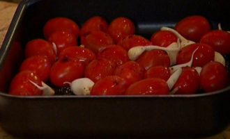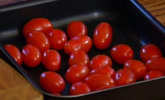 Помидоры черри выложить в глубокий противень, немного посыпать солью и черным перцем.