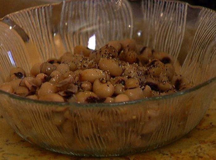 Готовую фасоль сбрызнуть оставшимся оливковым маслом, поперчить смесью нескольких видов перца, влить уксус из яблочного сидра, посолить.
