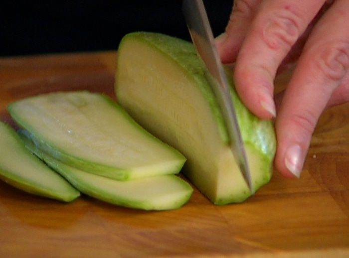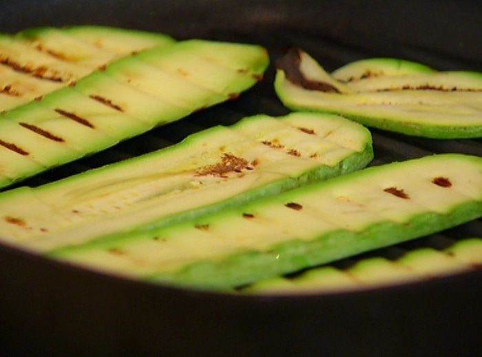 Разогреть сковороду-гриль и обжарить полоски цукини с обеих сторон.