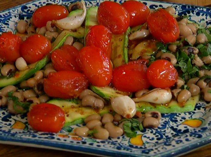 Выложить фасоль на тарелку, сверху разложить цукини и помидоры с чесноком. Полить соком, оставшимся в противне от помидоров.