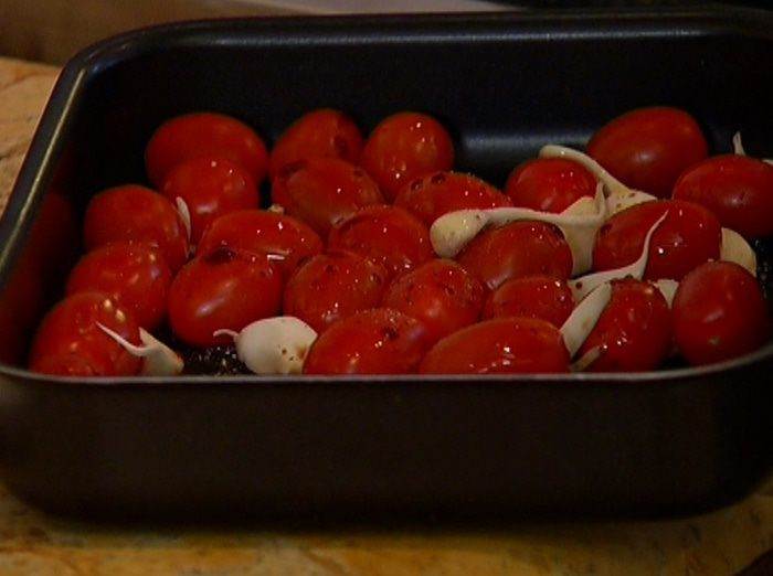 Чеснок почистить (молодой можно не чистить), добавить к помидорам, сбрызнуть все 1 ст. ложкой оливкового масла и бальзамическим уксусом, перемешать и отправить в разогретую духовку на 15-20 минут.